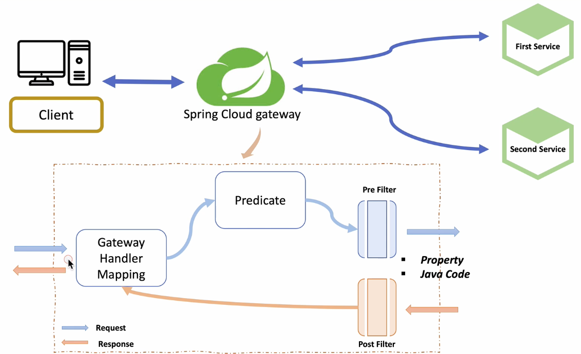 클라이언트가 Spring Cloud Gateway에 요청을 하게 되면 Spring Cloud gateway 내부의 Predicate에서 어떤 서비스로 갈지 판단 후 요청을 전달한다.