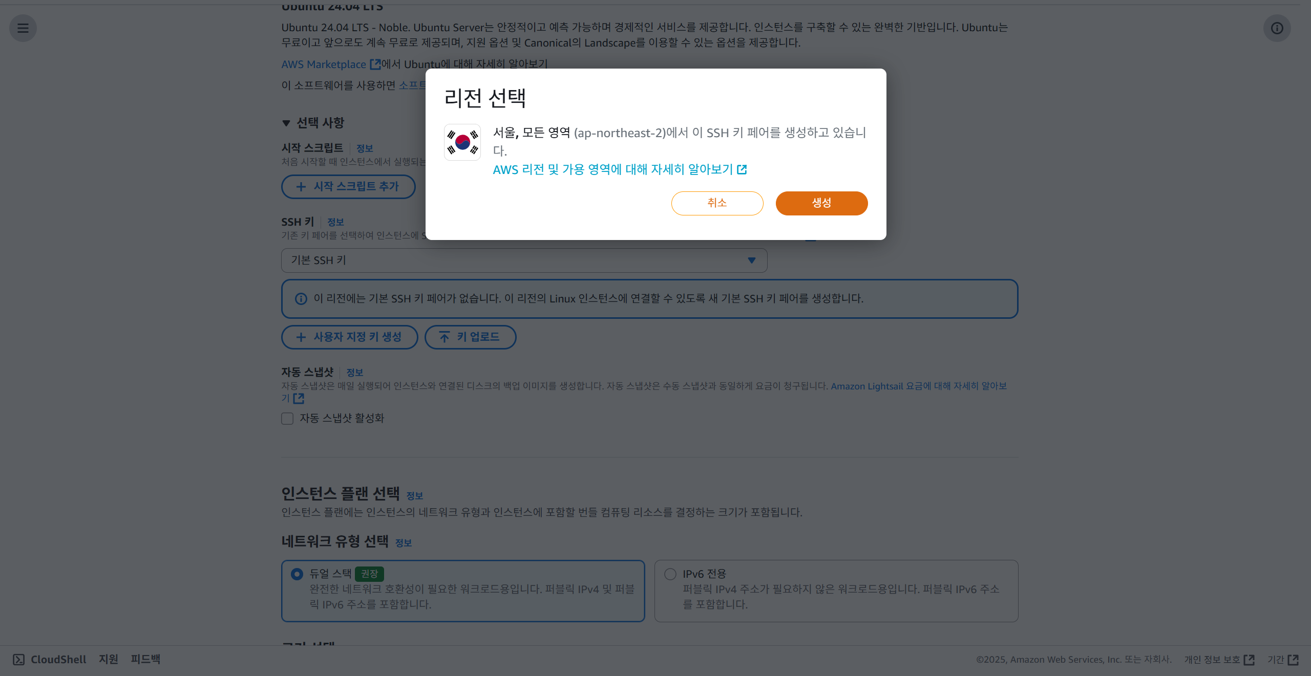 3-1. 리전 선택 창이 뜨면, 확인하고 생성 버튼을 누른다.