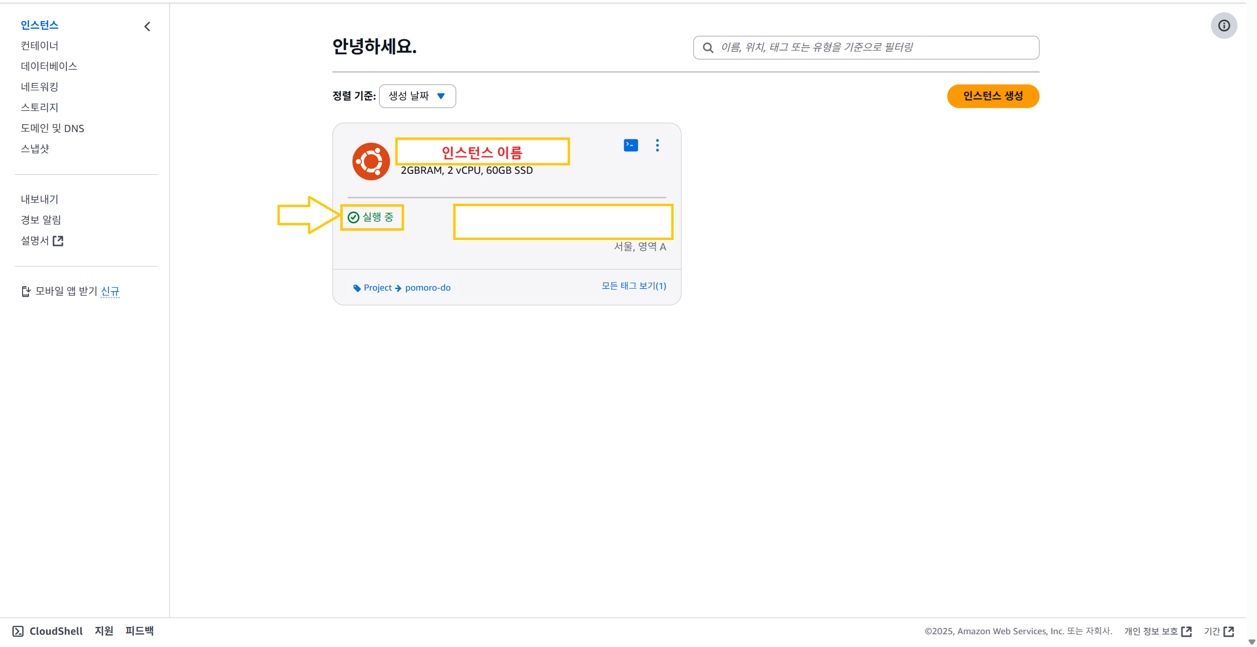 8. 생성된 인스턴스가 "실행중" 상태로 바꼈다. 이제 사용 가능하다!
