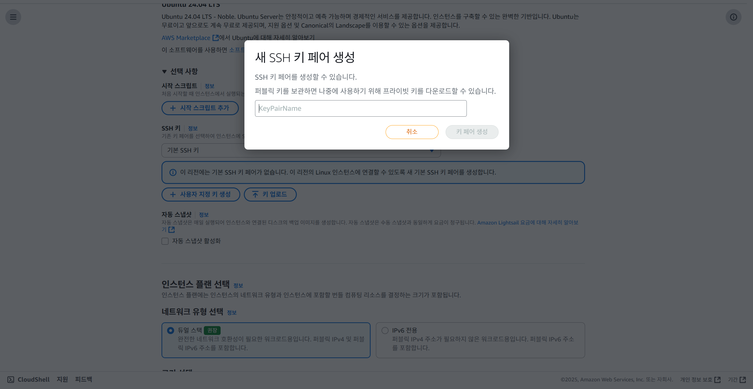 3-2. 새 SSH 키 페어 생성 창이 뜨면, "키 페어의 이름"을 정하고 "키 페어 생성" 버튼을 누른다.