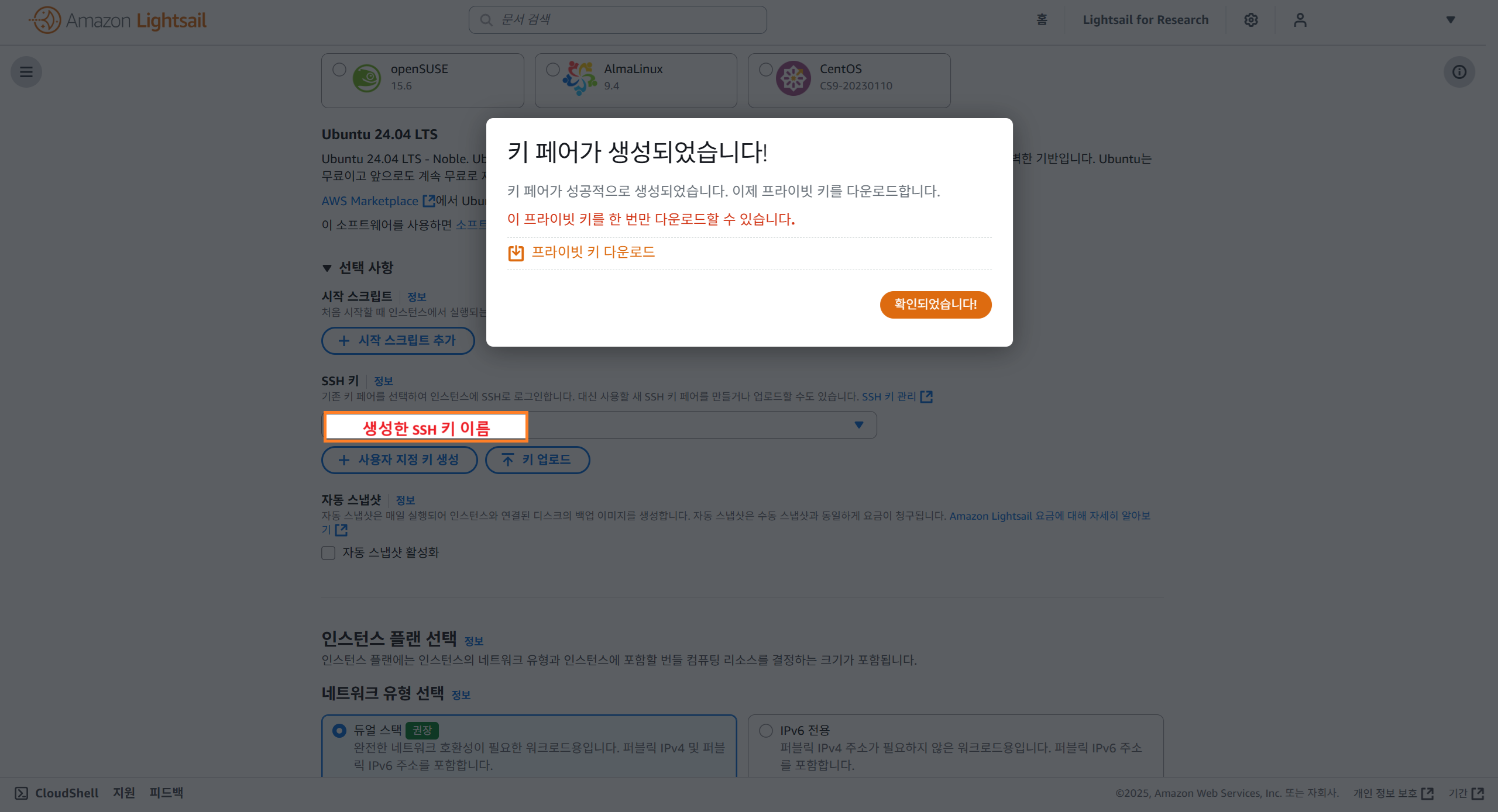 3-3. 키 페어가 생성되었다는 창이 뜨면, 프라이빗 키 다운로드를 누른다.