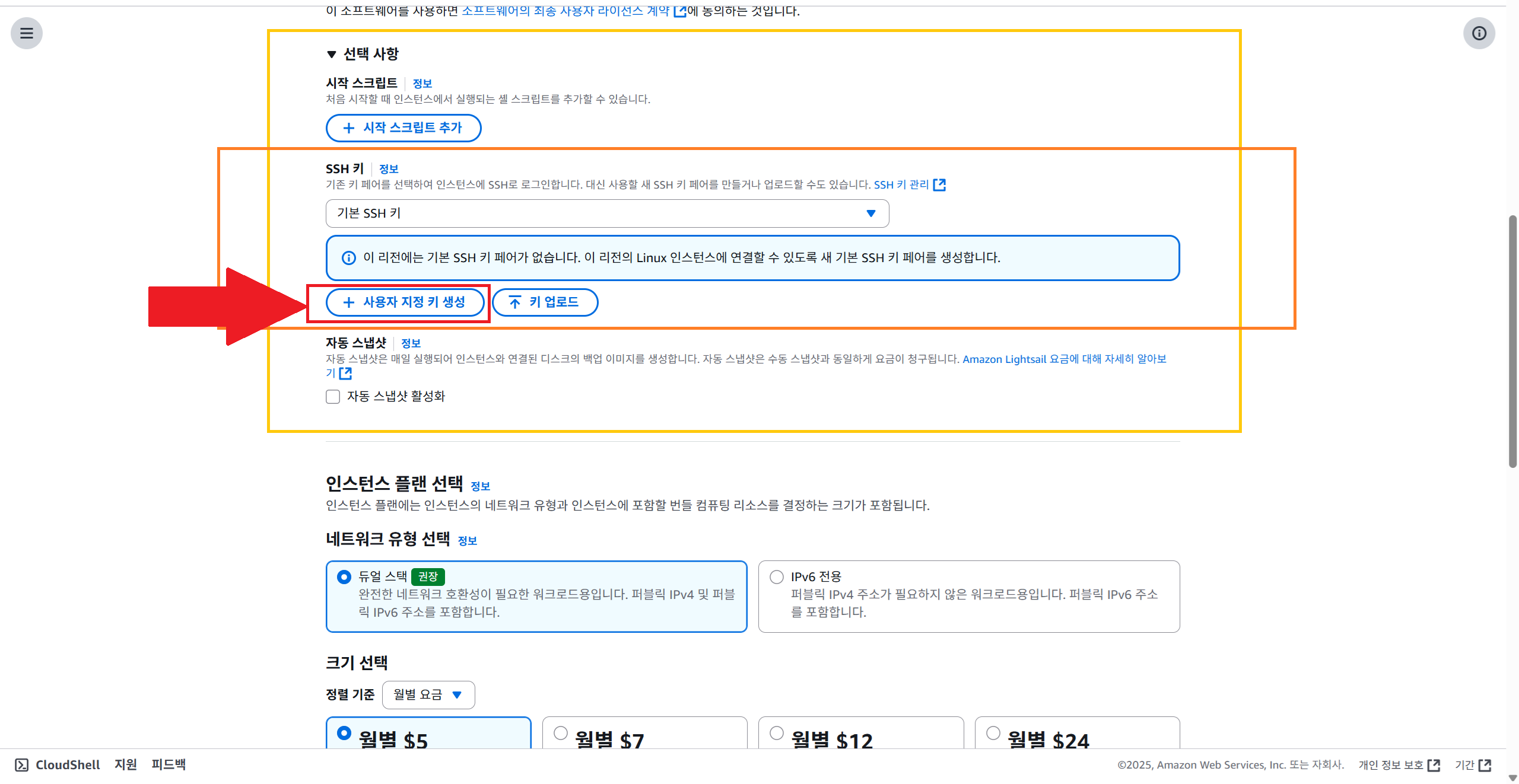 3. 선택 사항의 "SSH 키" 부문에서 "사용자 지정 키 생성" 버튼을 누른다.