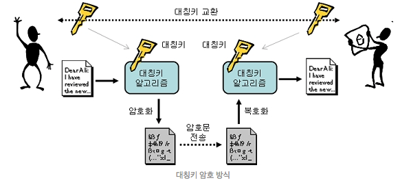 그림을 보자. 그림을 보게 되면 두 사람은 하나의 내용을 주고 받을 때 암호화 후 내용을 전달하고 복호화를 하여 읽게 된다.그리고 이 때 같은 키(대칭키)를 사용하는 방식이다. 이 경우 대칭키가 있게 되면 내용을 모두 읽을 수 있게 된다. 속도가 빠른 장점이 있지만 만약 누군가가 이 대칭키를 악의적으로 가진다면 내용을 별다른 노력없이 볼 수 있게 된다.