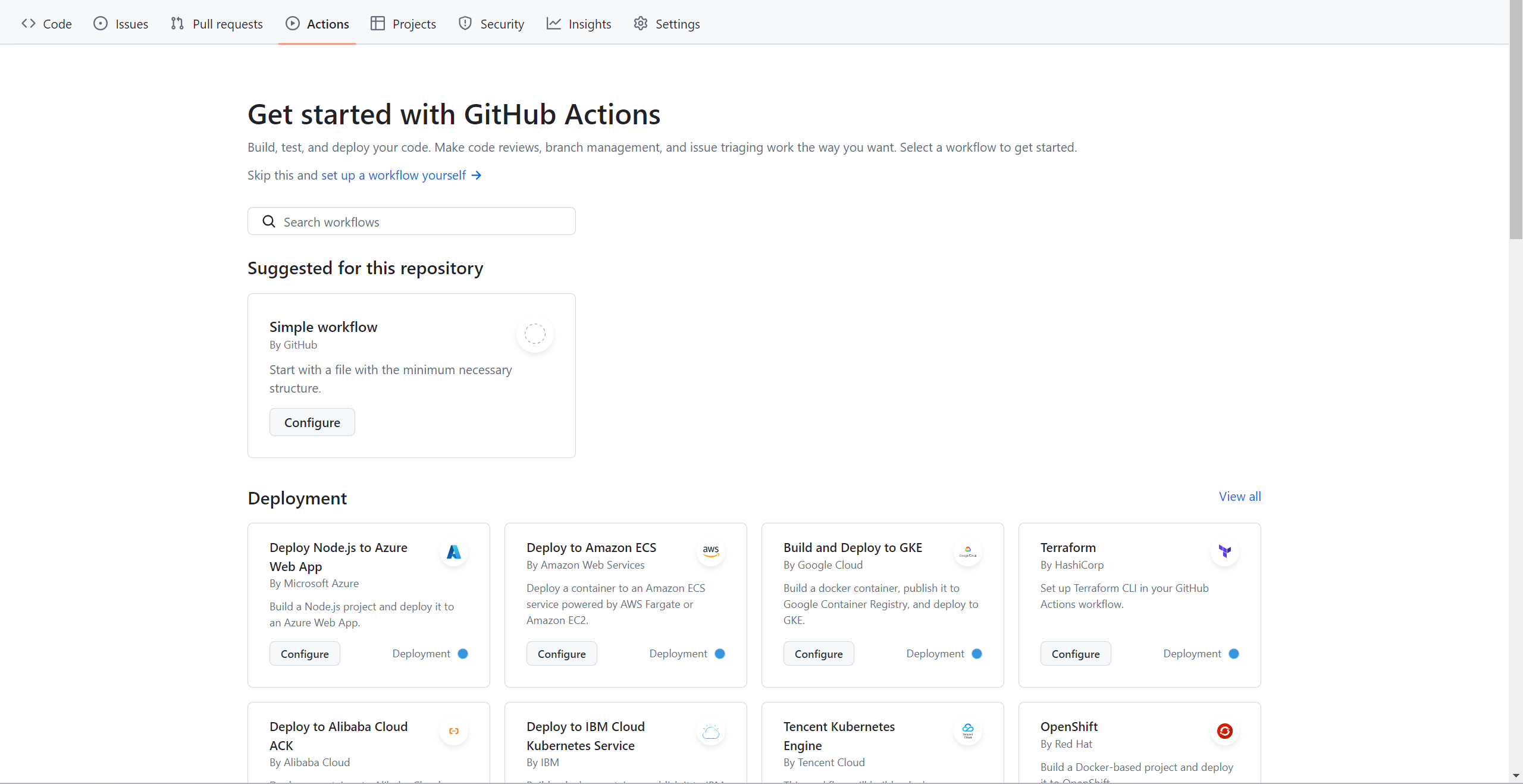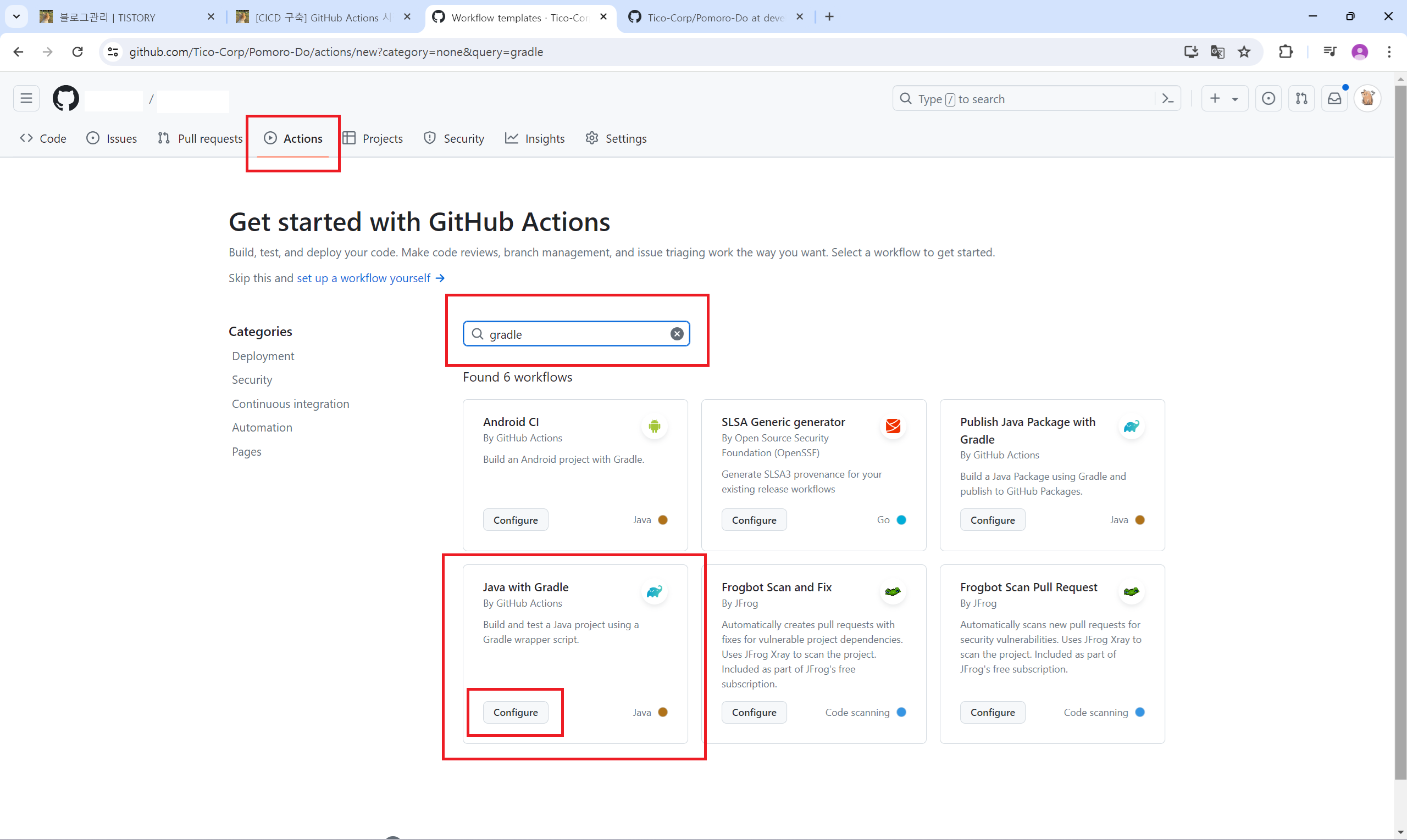 3. Java with Gradle의 Configure를 클릭하면, Gradle wrapper 스크립트를 사용하여 Java 프로젝트를 빌드하고 테스트할 수 있는 workflow를 생성할 수 있다.