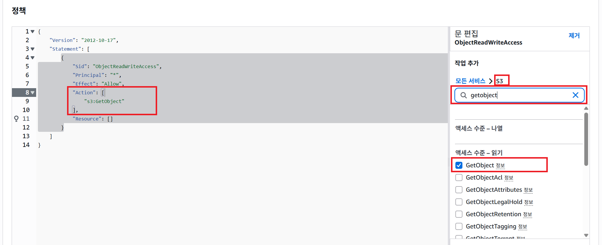 - Actions에서 GetObject를 설정합니다.