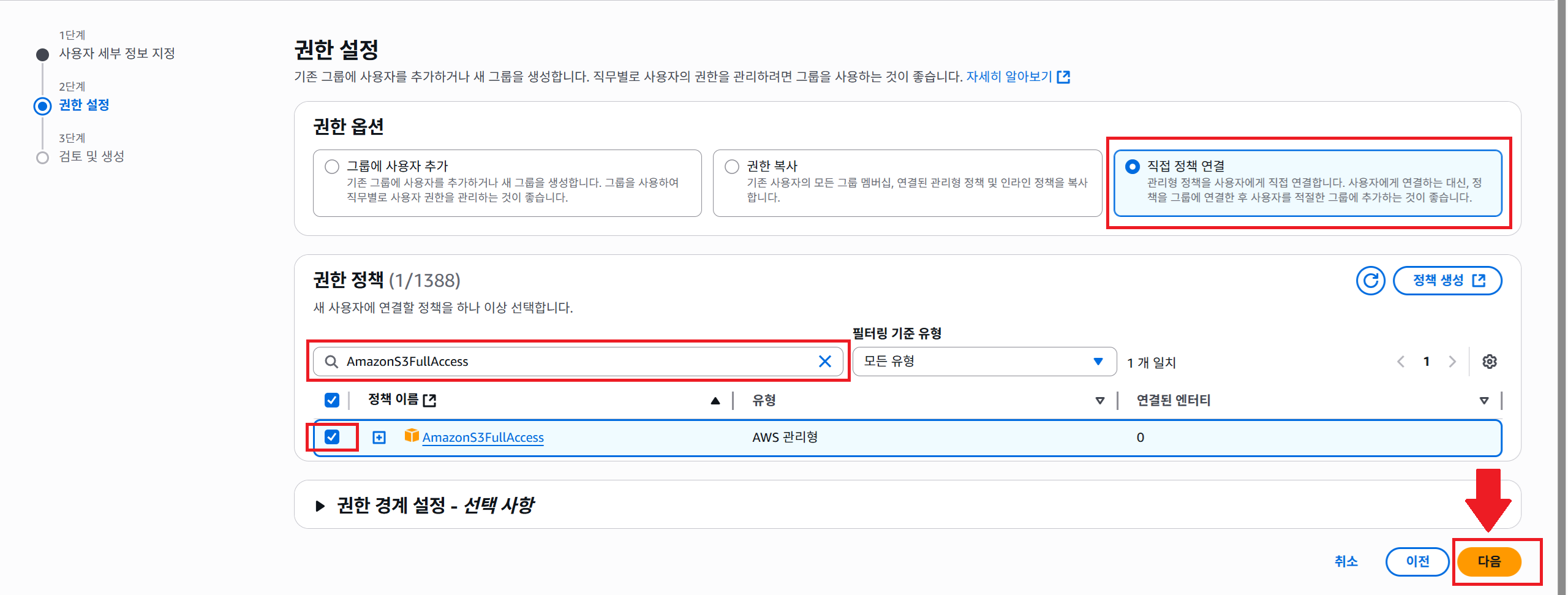 2. "권한 정책" 섹션의 검책 창에 "AmazonS3FullAccess"을 검색하고, 체크 표시를 클릭합니다