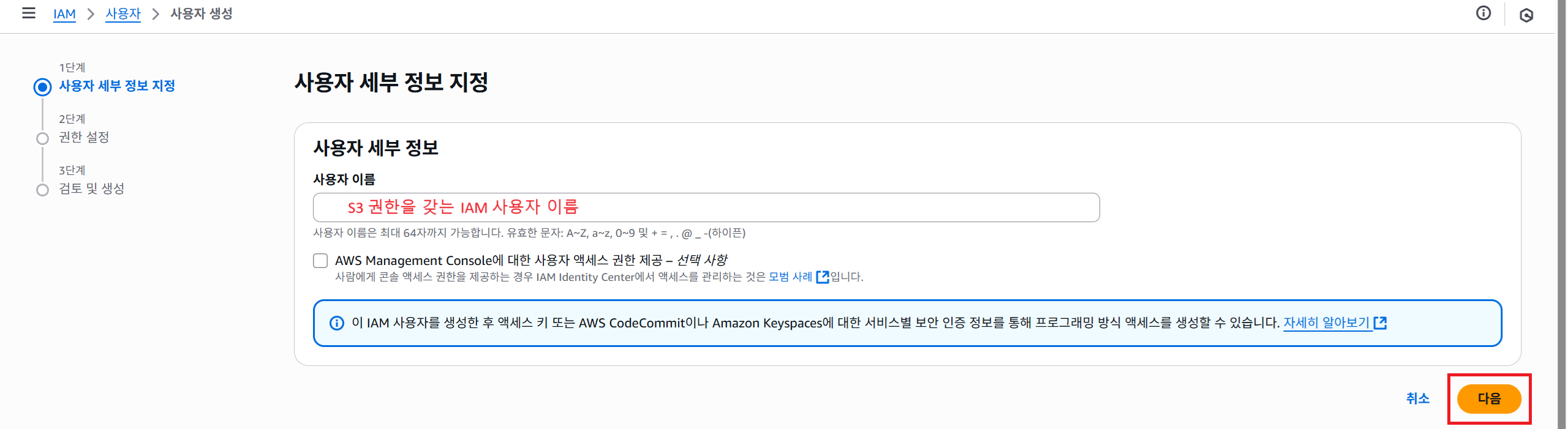 2. [ AWS Management Console 액세스 권한 ]은 불필요하므로 체크하지 않습니다.