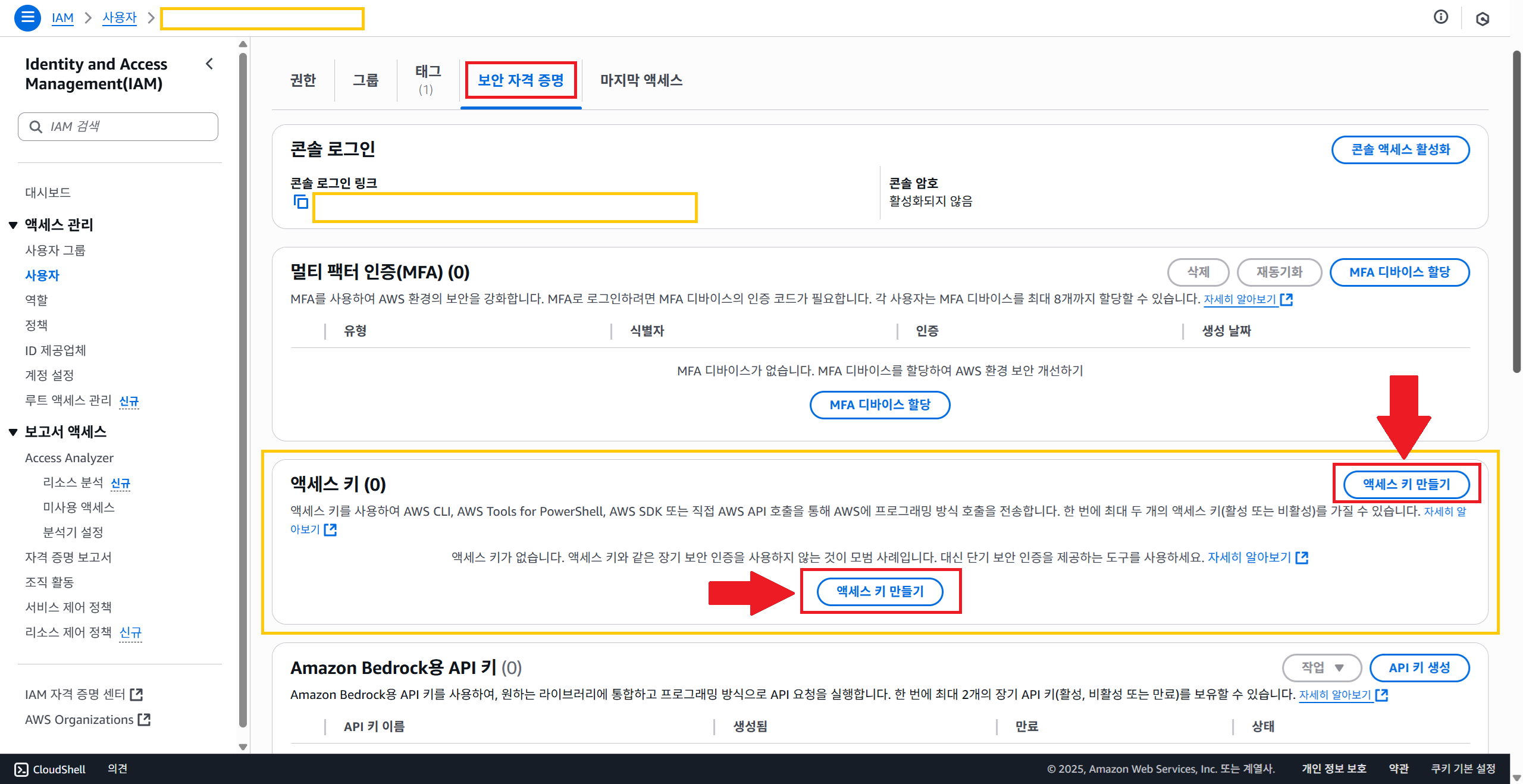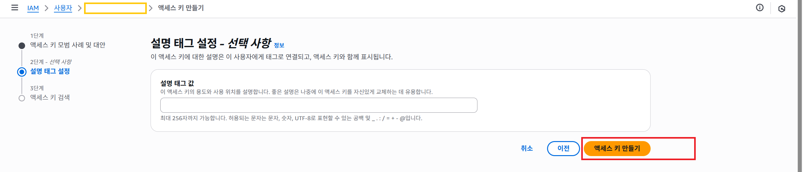 - Secret Access Key: 비밀 키 (비밀번호 역할, 절대 외부 공개 금지)