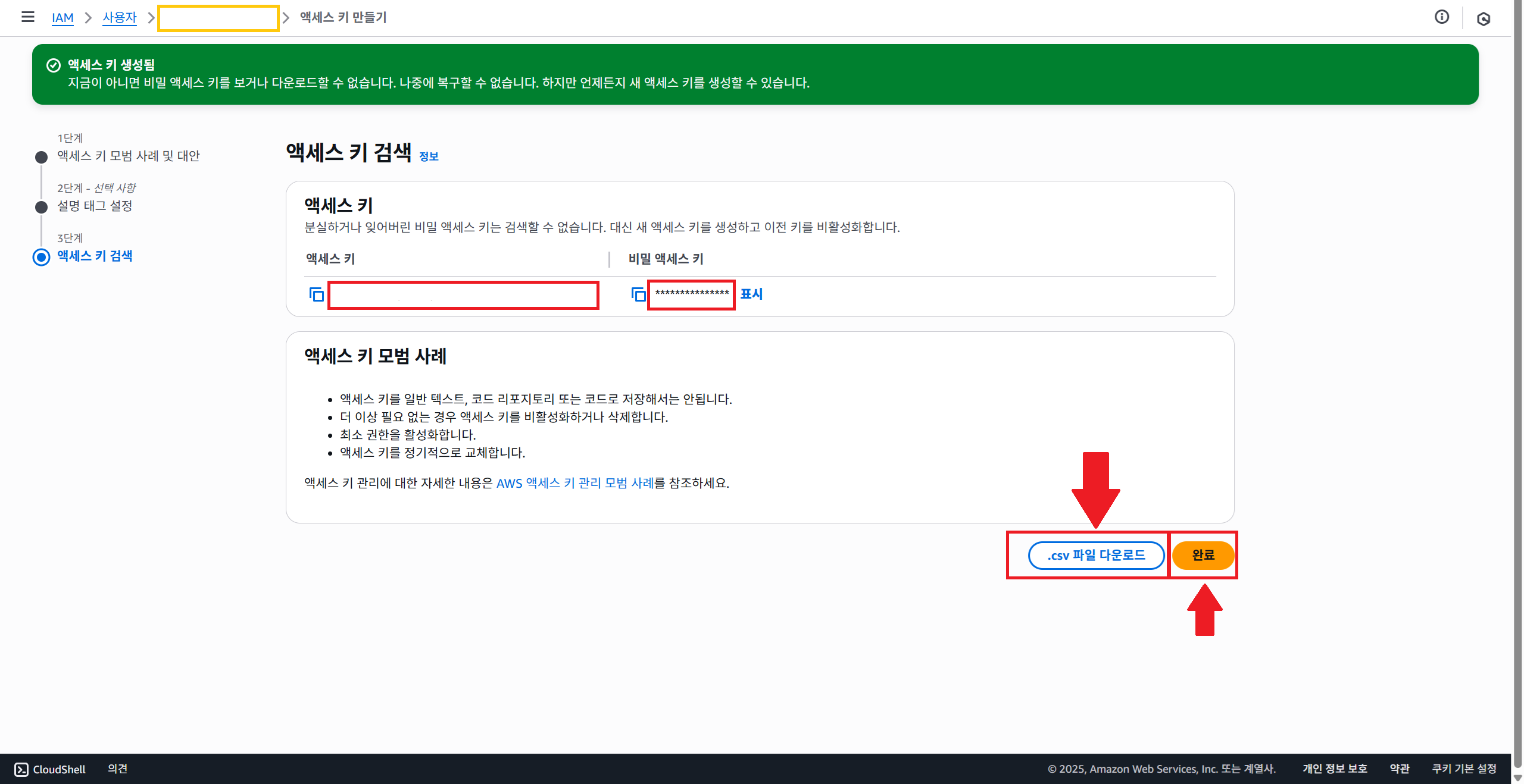 - ⚠️ Secret Access Key는 한 번만 확인 가능하므로 반드시 안전한 곳에 저장해야 합니다.