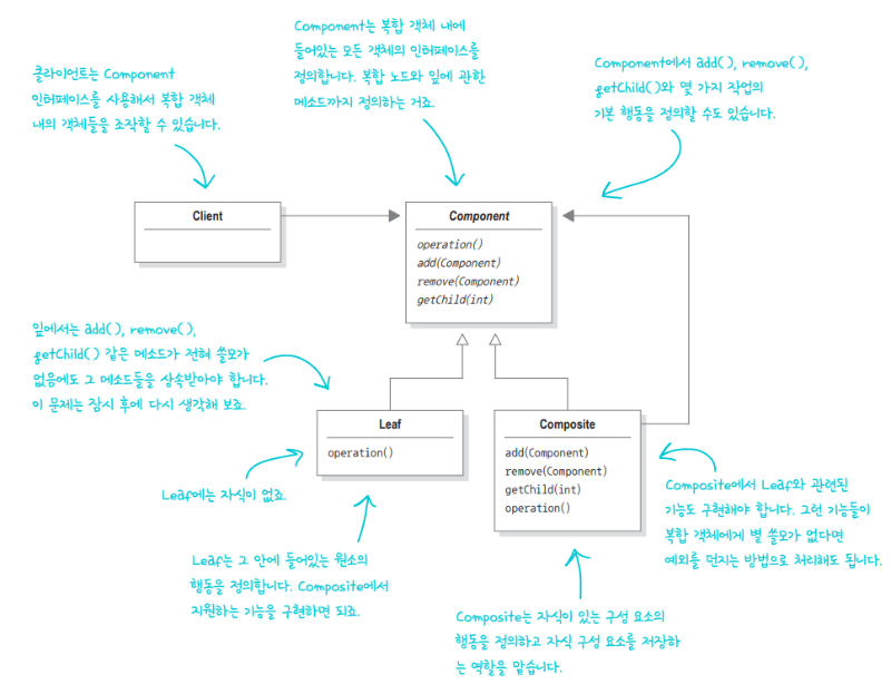 객체들의 관계를 트리 구조로 구성하여 부분-전체 계층을 표현하는 패턴이다. 사용자는 컴퍼지트패턴을 통해 단일 객체와 복합 객체 모두 동일하게 다룰 수 있다.