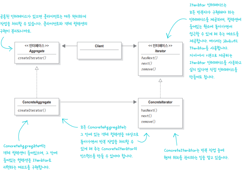 컬렉션의 구현 방법을 노출하지 않으면서 집합체 내의 모든 항목에 접근하는 방법을 제공한다.