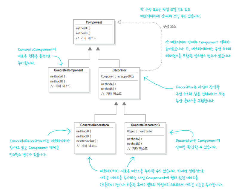 주어진 상황 및 용도에 따라 어떤 객체에 책임을 덧붙이는 패턴이다. 데코레이터를 사용하면 서브클래스를 만들 때보다 훨씬 유연하게 기능을 확장할 수 있습니다.