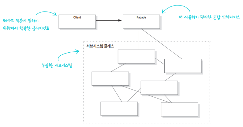 서브시스템에 있는 일련의 인터페이스를 통합 인터페이스로 묶어준다. 또한 고수준 인터페이스도 정의하므로 서브시스템을 더 편리하게 사용할 수 있다.