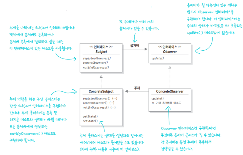 객체들 사이에 1 : N 의 의존관계를 정의하여, 어떤 한 객체의 상태가 변할 때, 의존관계에 있는 모든 객체들이 통지받고 자동으로 갱신될 수 있게 만드는 패턴이다.
