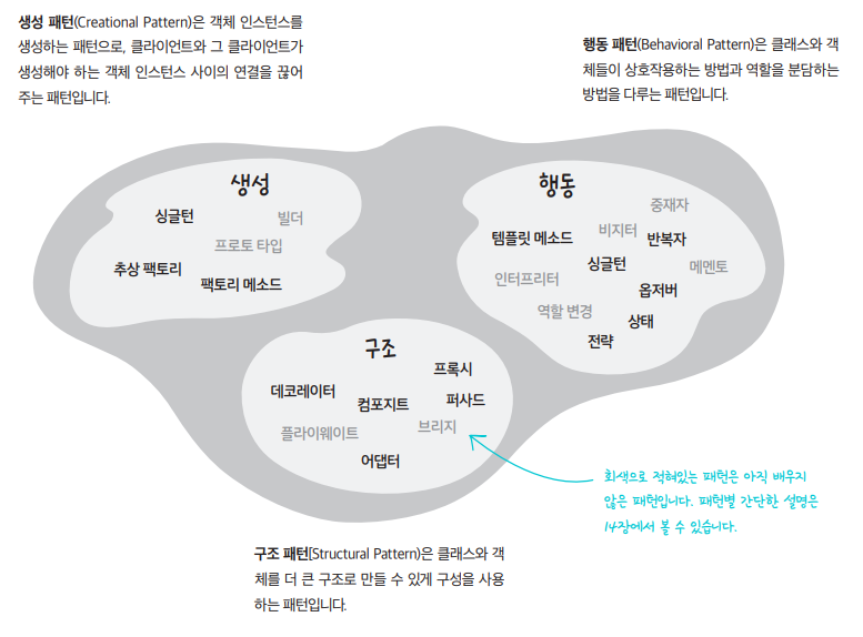 디자인 패턴의 카테고리를 "생성 패턴(Creational Pattern)", "구조 패턴(Structural Pattern)", "행동 패턴(Behavioral Pattern)" 3가지로 구분하고 다음과 같이 23개로 나누어져 있다. 이는 GoF(Gang of Four) 디자인 패턴이라 불리며, 4명의 유명한 개발자들에 의해 고안되었다.