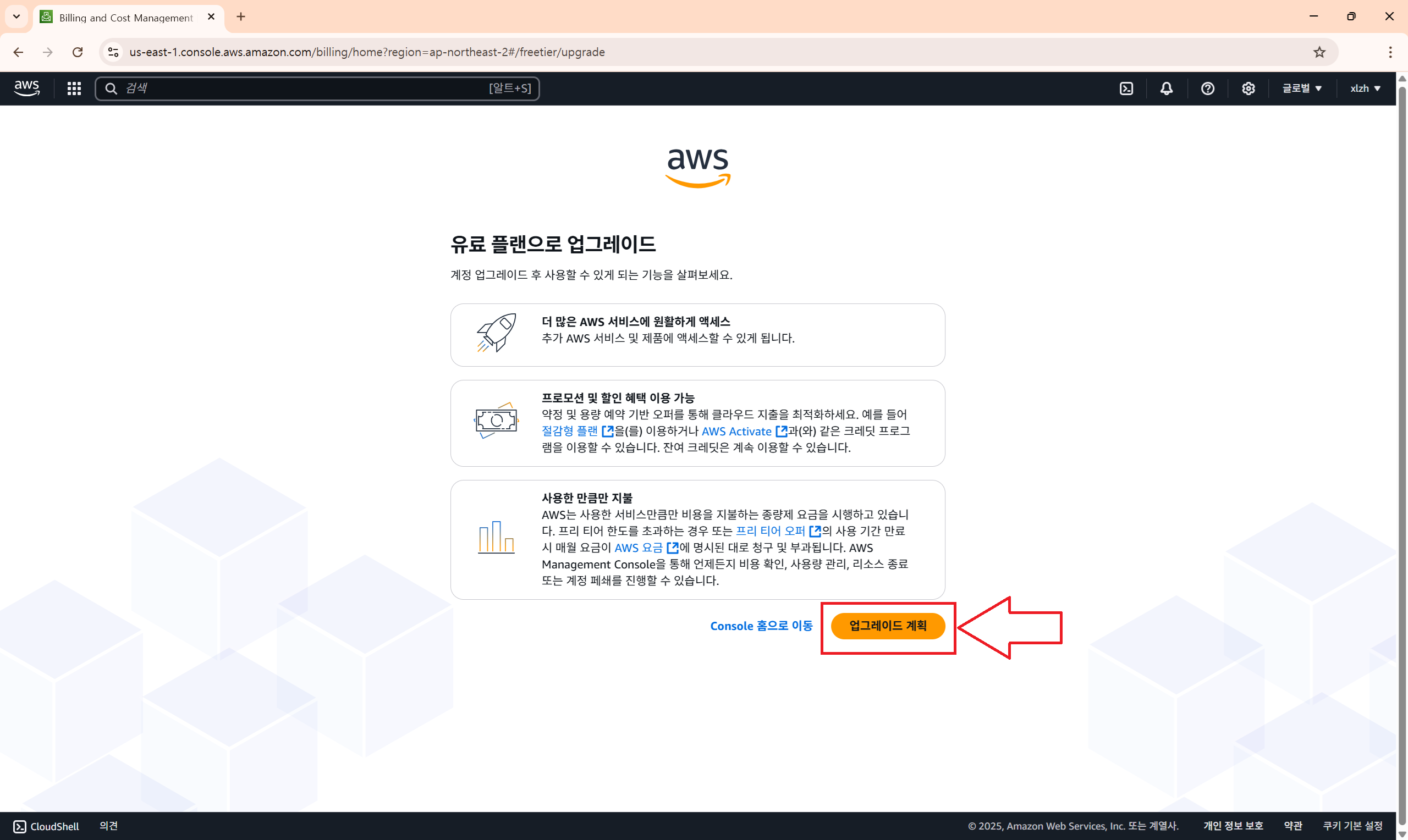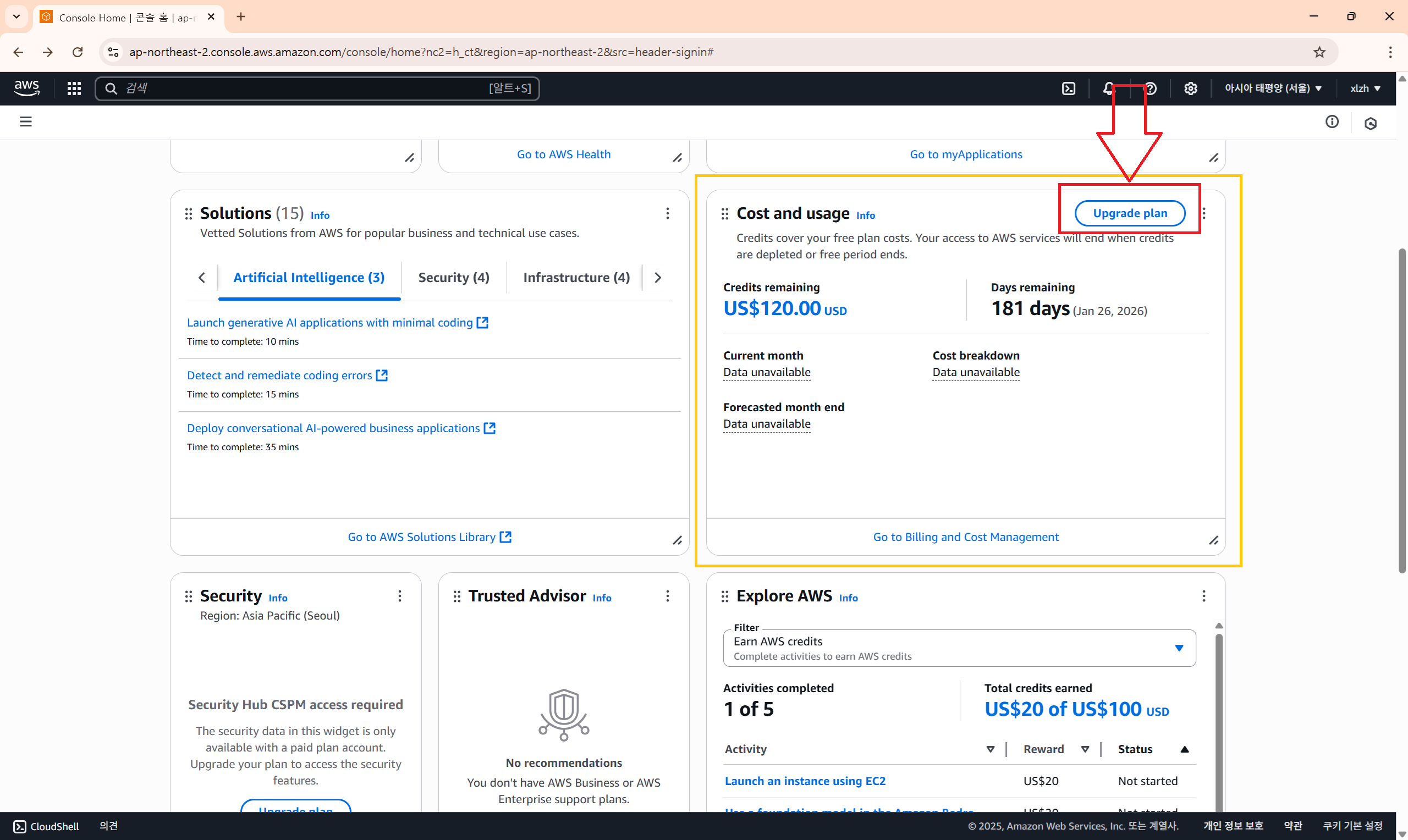 2. Cost and usage 에서 "Upgrade plan" 클릭