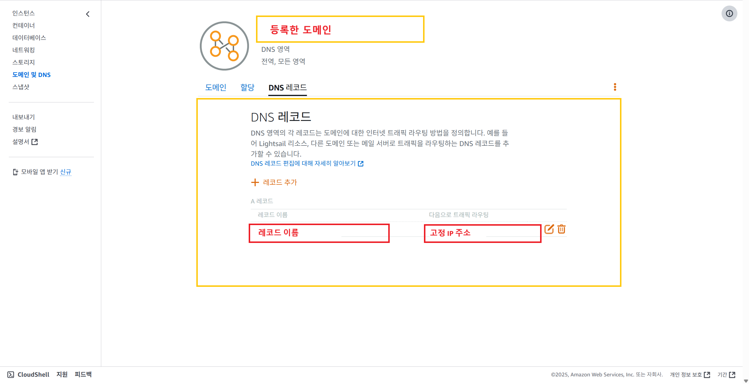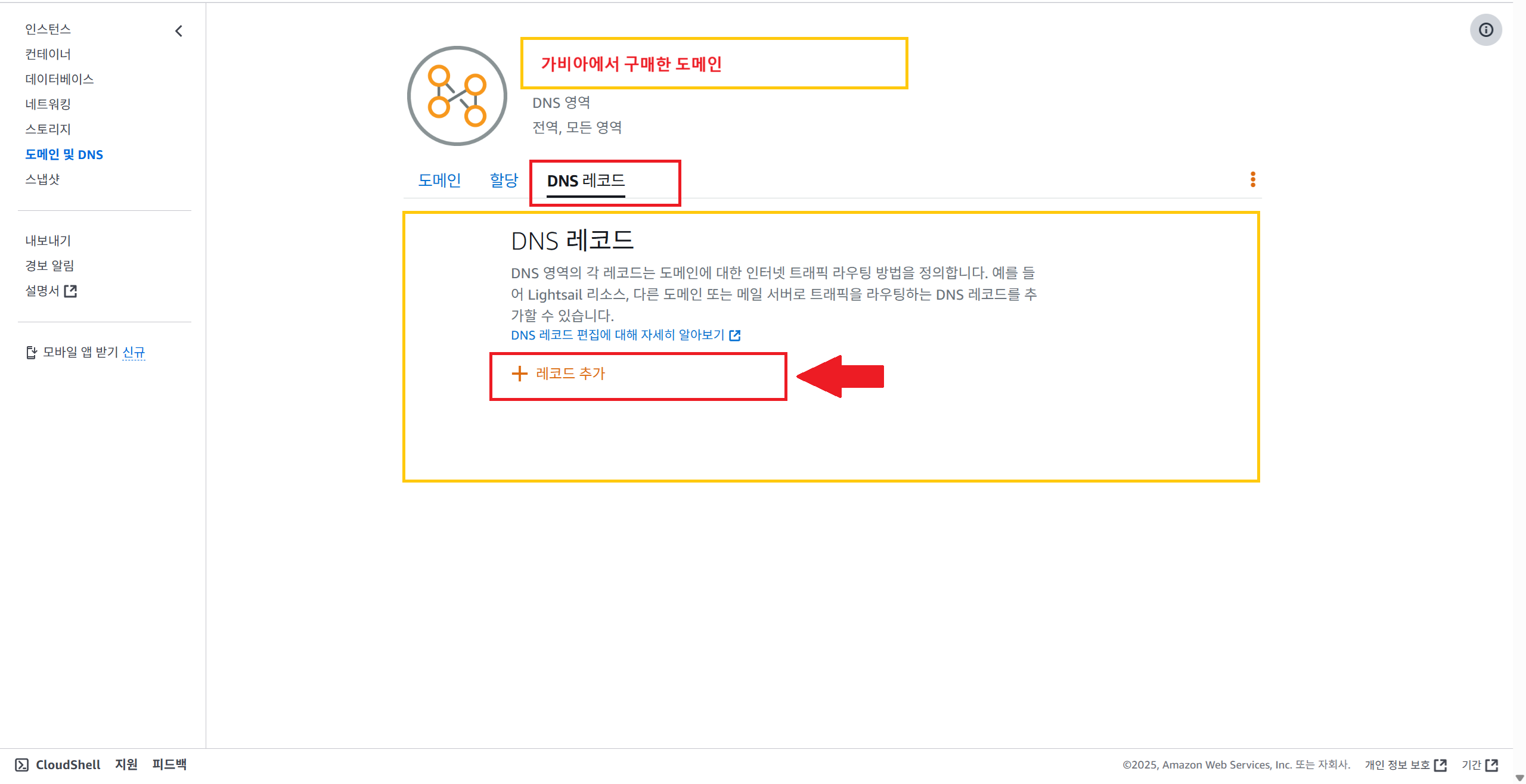 - AWS Lightsail > [ 도메인 및 DNS ] > [ DNS 레코드 ] > [ 레코드 추가 ] 에서 연결하는 방법