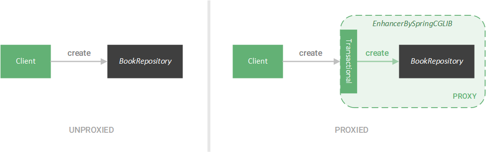 CGLib Proxies는 Spring Framework가 BookRepository를 감싸고 Bean들에게 create(...) 메서드를 원자적으로 실행하도록 지시하는 Proxy를 생성한다.