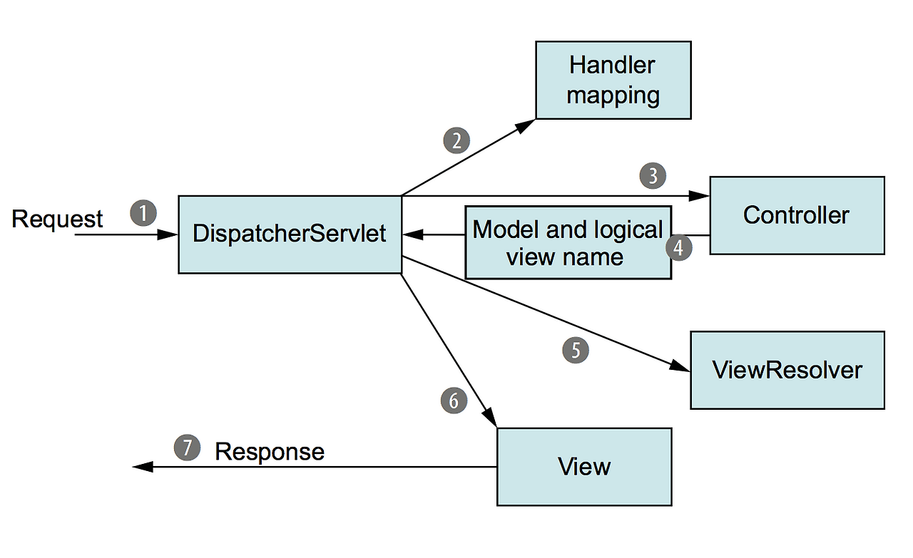 HTTP 요청 → DispatcherServlet → HandlerMapping → Controller → ViewResolver