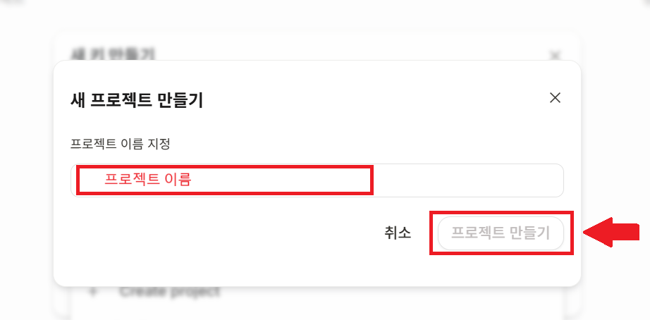 - 새 프로젝트 만들기 팝업 창이 열리면, 프로젝트 이름을 지정하고, 우측 하단의 "프로젝트 만들기" 버튼을 클릭합니다.
