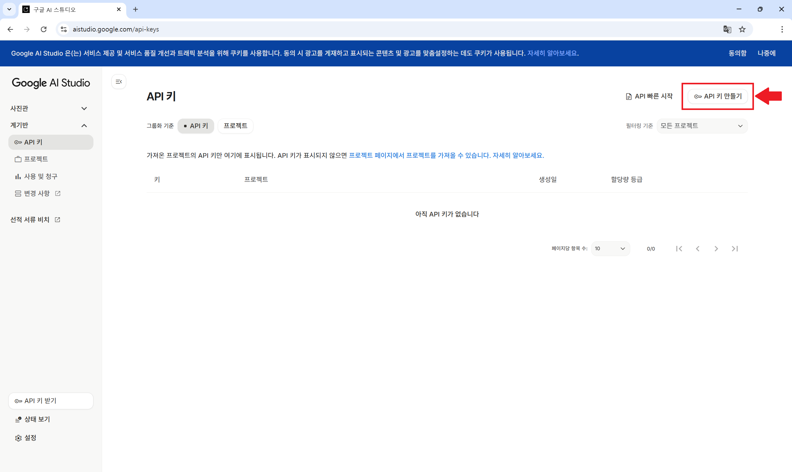 1. API 키 대시보드의 우측 상단 "API 키 만들기" 버튼을 클릭합니다.