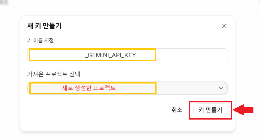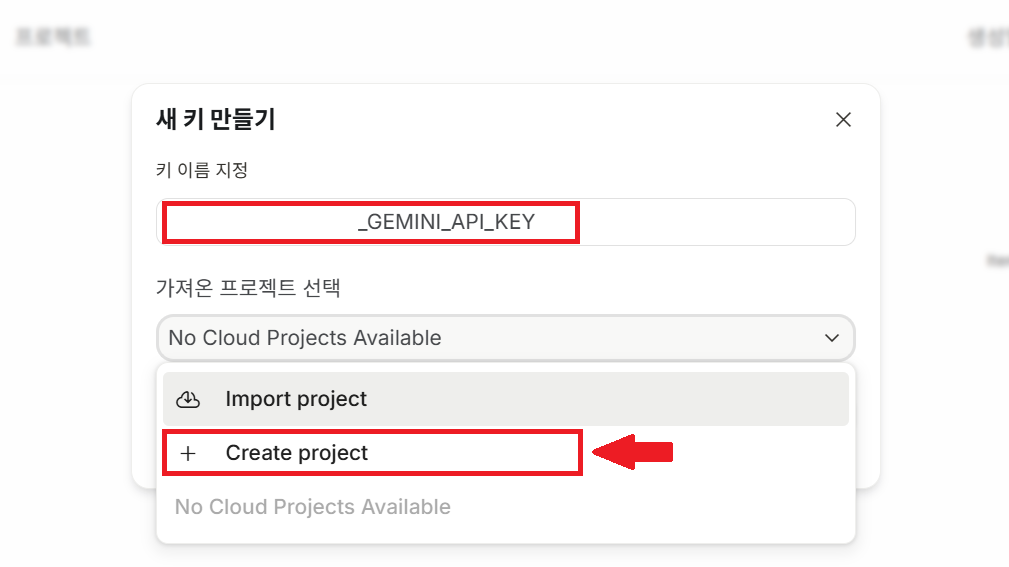 2. 팝업창이 열리면, 키 이름을 지정하고, 프로젝트 선택 또는 새 프로젝트 생성합니다.