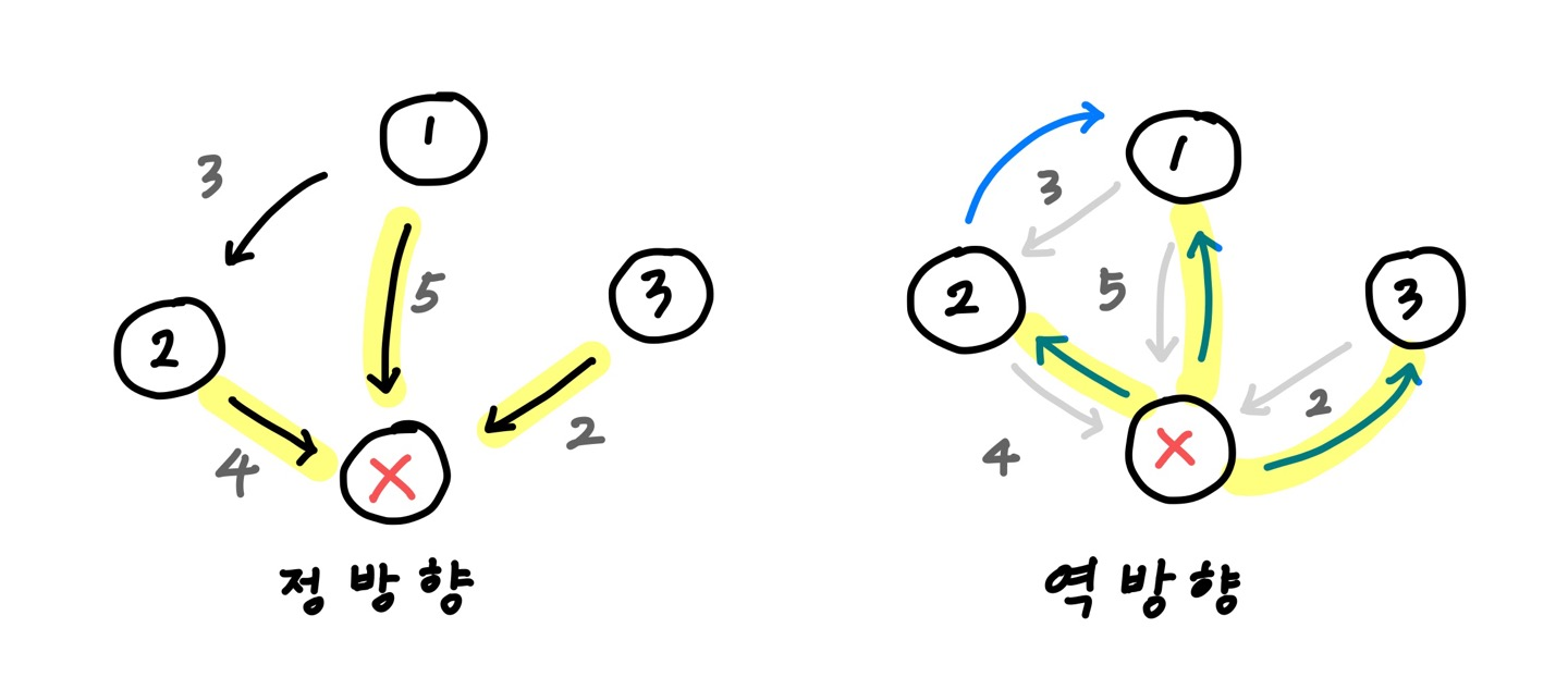 - 처음에 그래프를 입력받을 때, 역방향 그래프도 입력받는다.