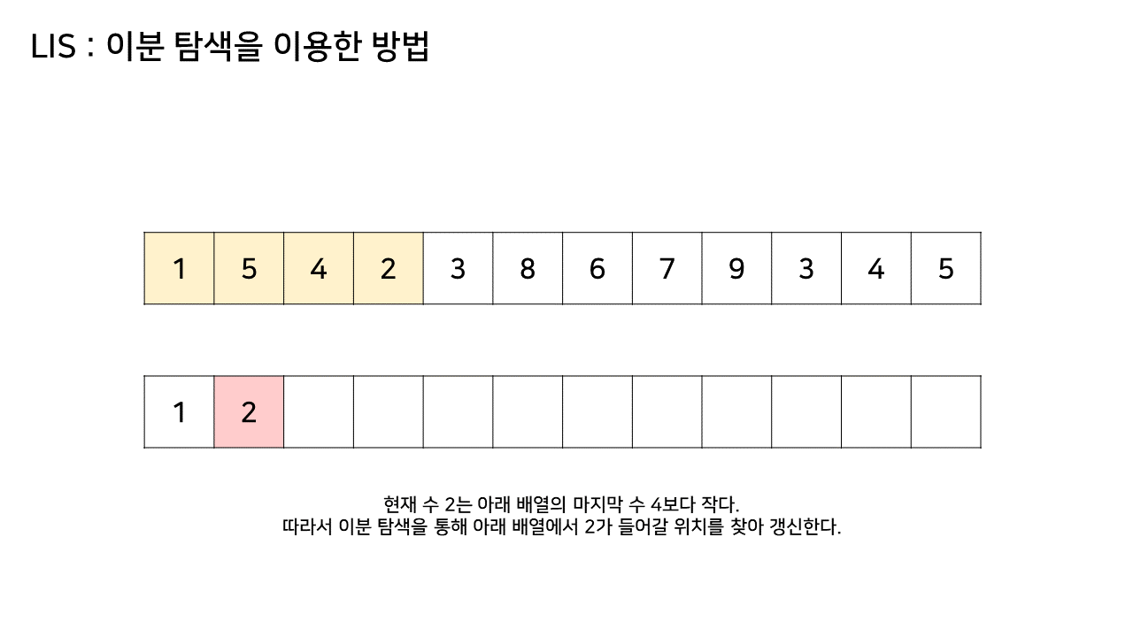 - 이분 탐색(Binary Search)을 이용한 방법은 LIS를 기록하는 배열을 하나 더 두고, 원래 수열에서의 각 원소에 대해 LIS 배열 내에서의 위치를 찾는다.