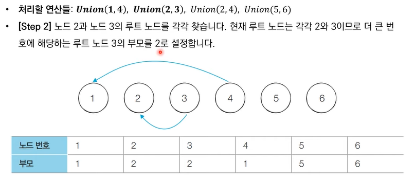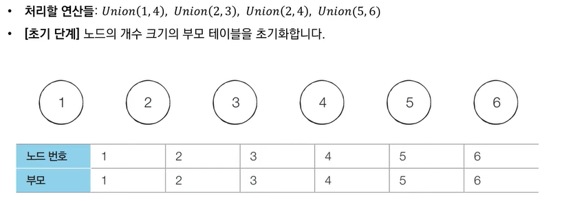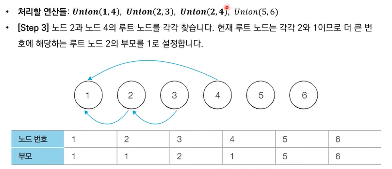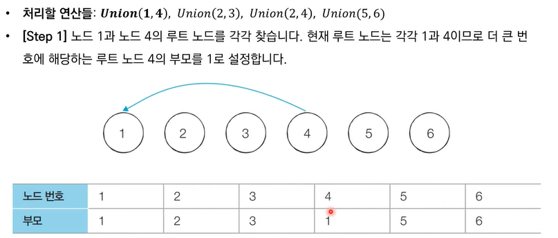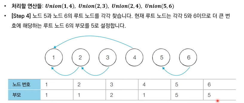 이러한 4개의 union 연산은 각각 '1과 4는 같은 집합', '2와 3은 같은 집합', '2와 4는 같은 집합', '5와 6은 같은 집합'이라는 의미를 가지고 있다.