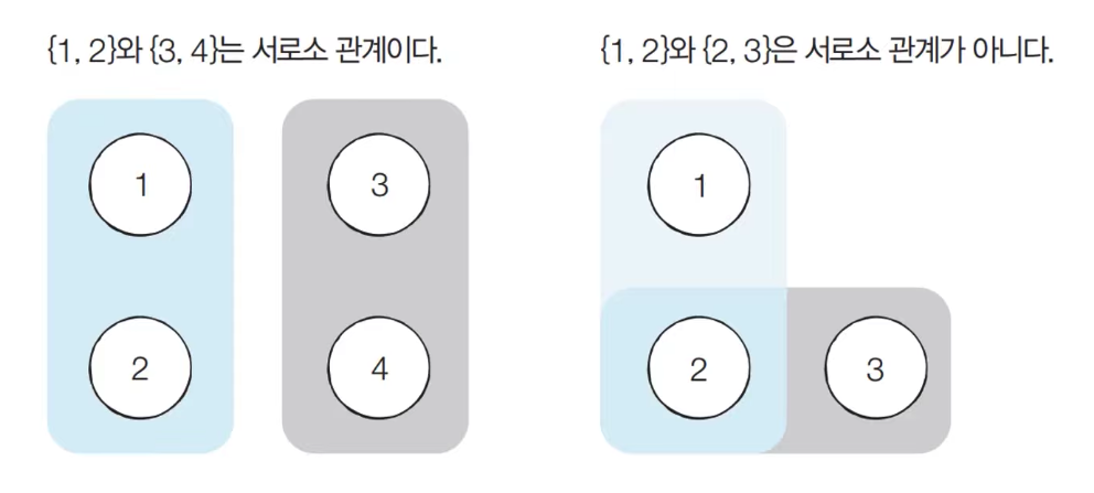 - 서로소 집합(Disjoint Sets)이란 공통 원소가 없는 두 집합을 의미한다.