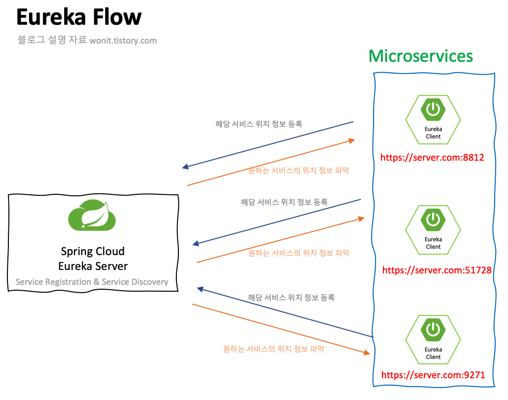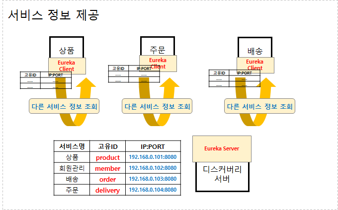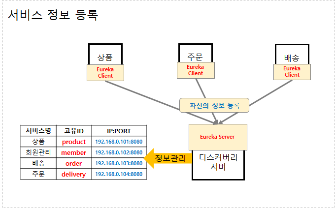 - Eureka Server (서버 라이브러리) : 서비스들의 정보를 관리, 제공