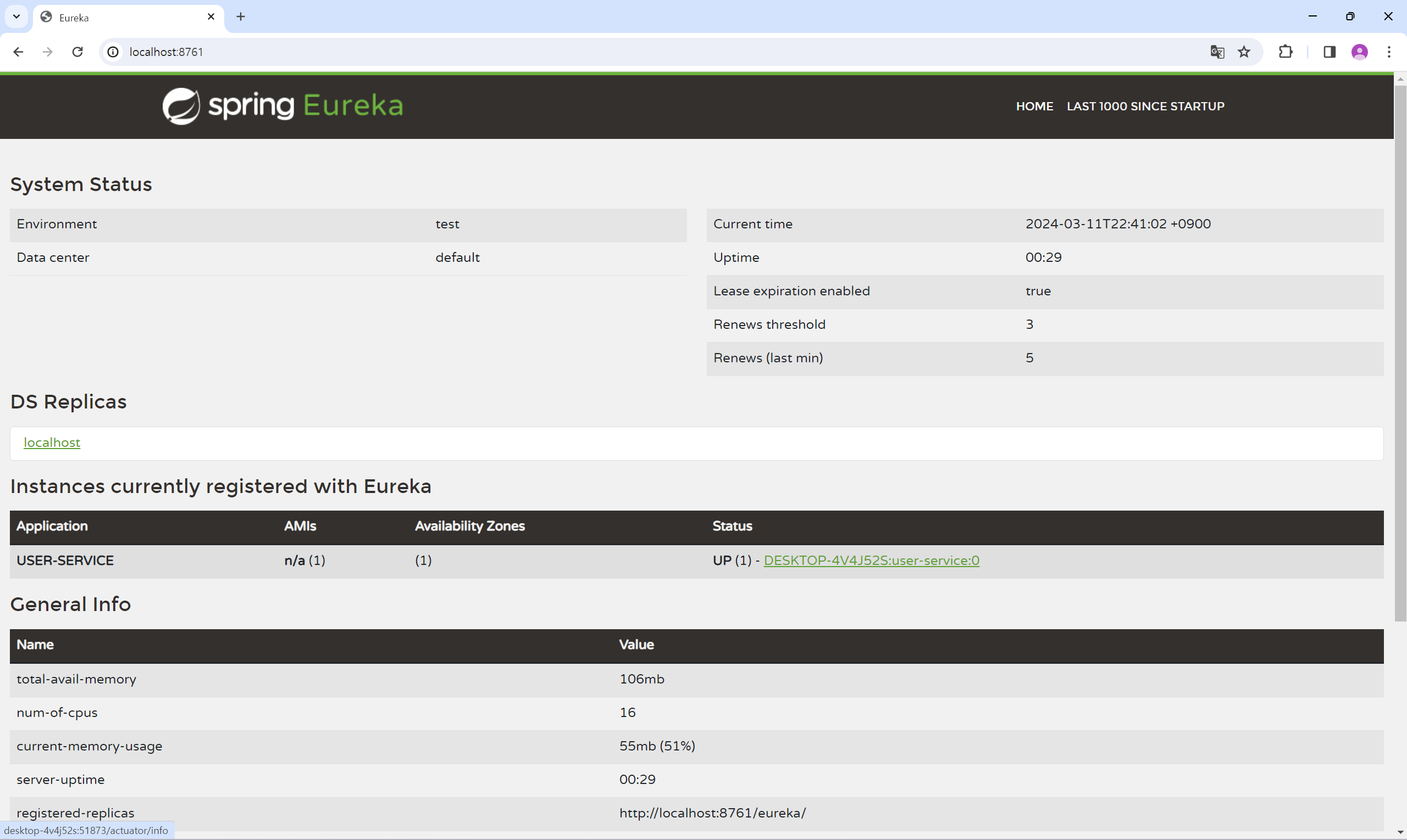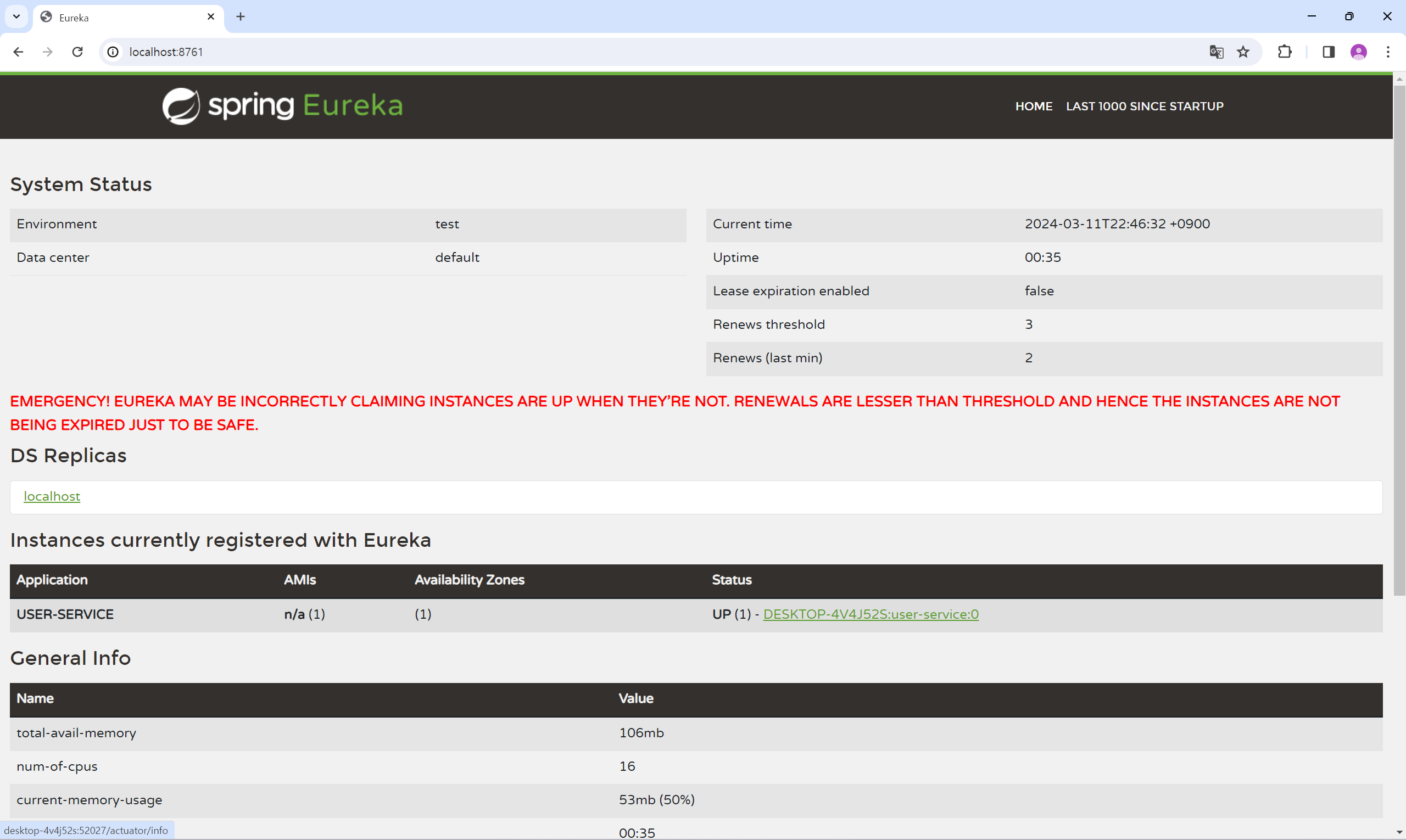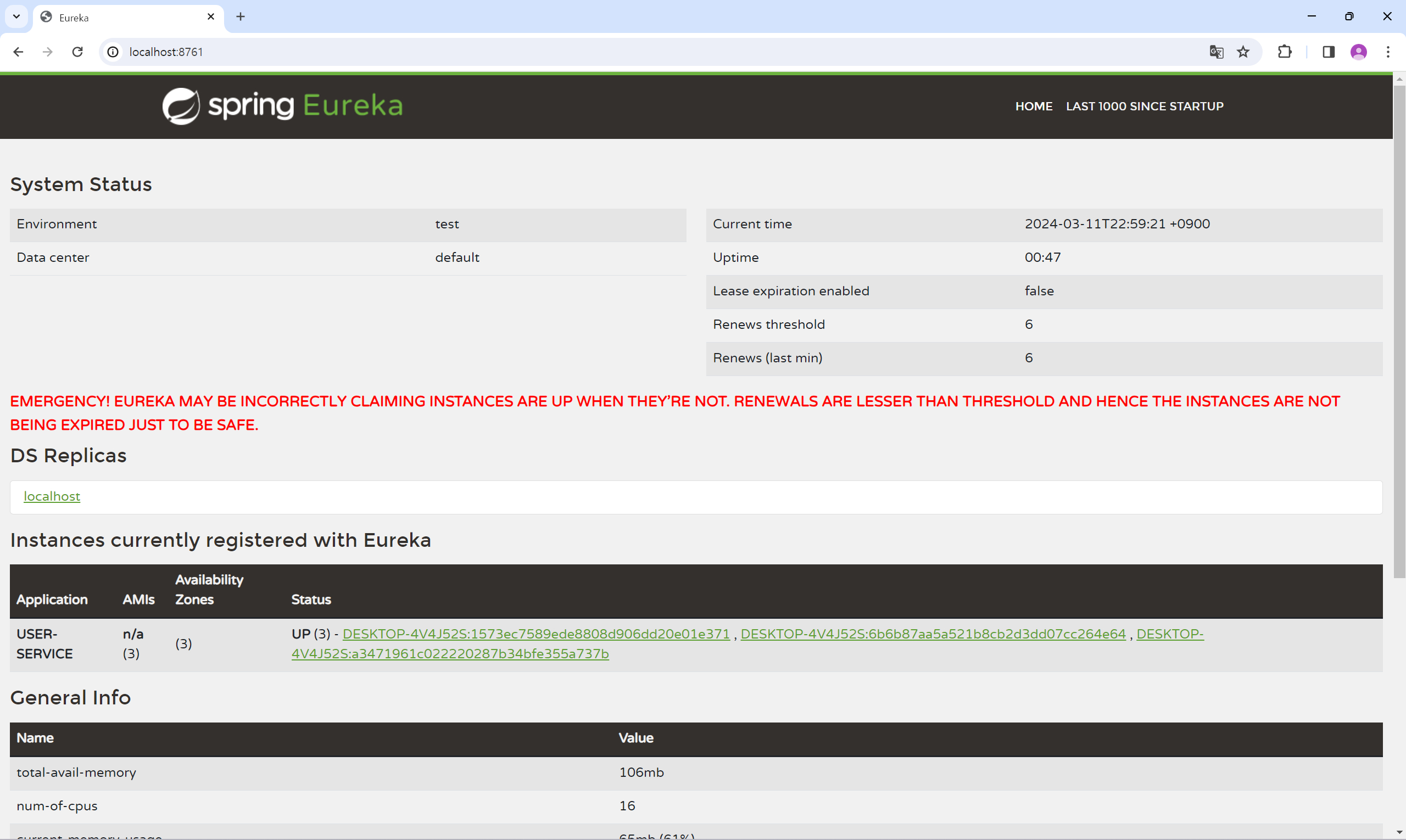 ๊ทธ๋ฌ๋, ์์ ๊ฐ์ด ์ค์ ํ ๊ฒฝ์ฐ eureka ์๋ฒ์ ์ธ์คํด์ค ์ด๋ฆ์ 0์ผ๋ก ๊ณ ์ ๋์ด ์๋ฒ๋ฅผ ์ฌ๋ฌ ๊ฐ ๋์ฐ๋๋ผ๋ ESKTOP-4V4J52S:user-service:0 ๋ก ์ธ์คํด์ค๊ฐ ํ ๊ฐ๋ง ๋ฑ๋ก๋๊ฒ ๋๋ค.