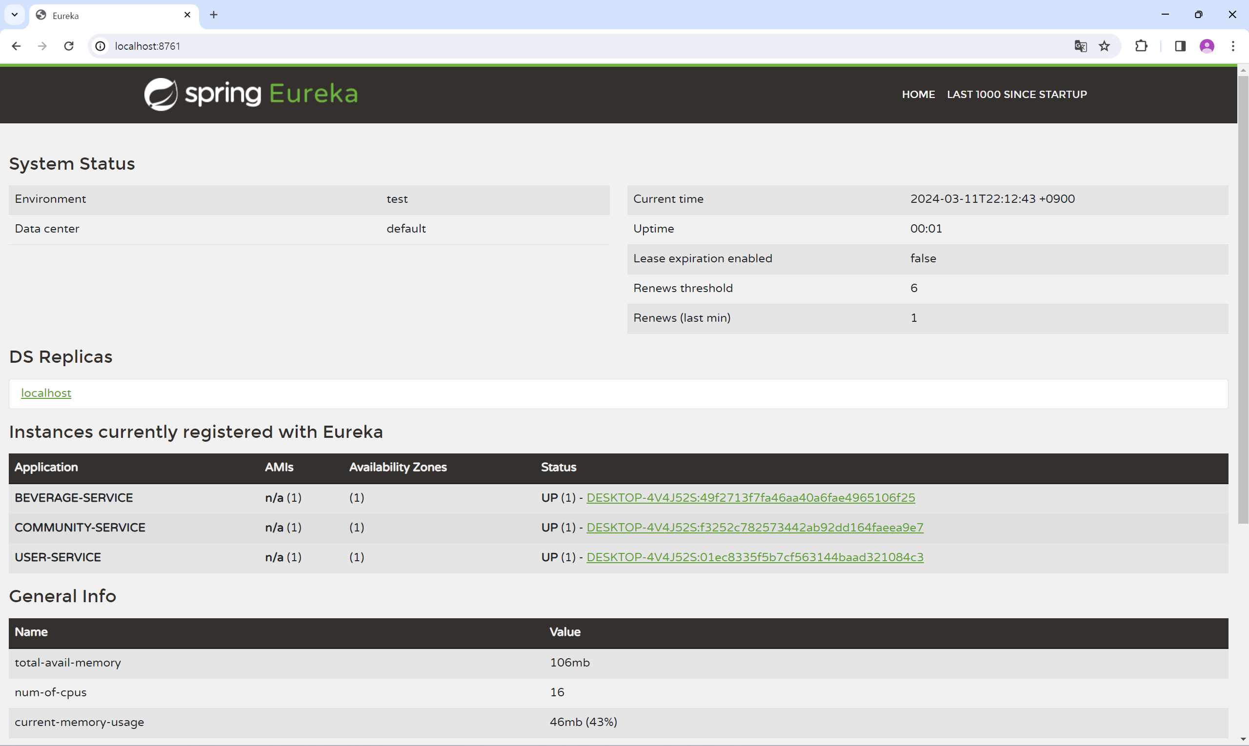 - ํ๋ก์ ํธ๋ฅผ eureka ์๋ฒ์ ๋ฑ๋กํ๊ณ ์ ๋ ์นด ์๋ฒ๋ก ์ ์ํด ๋ณด๋ฉด ์์ ๊ฐ์ด ๋ฑ๋ก๋ ์๋น์ค๋ฅผ ํ์ธํ ์ ์๋ค.